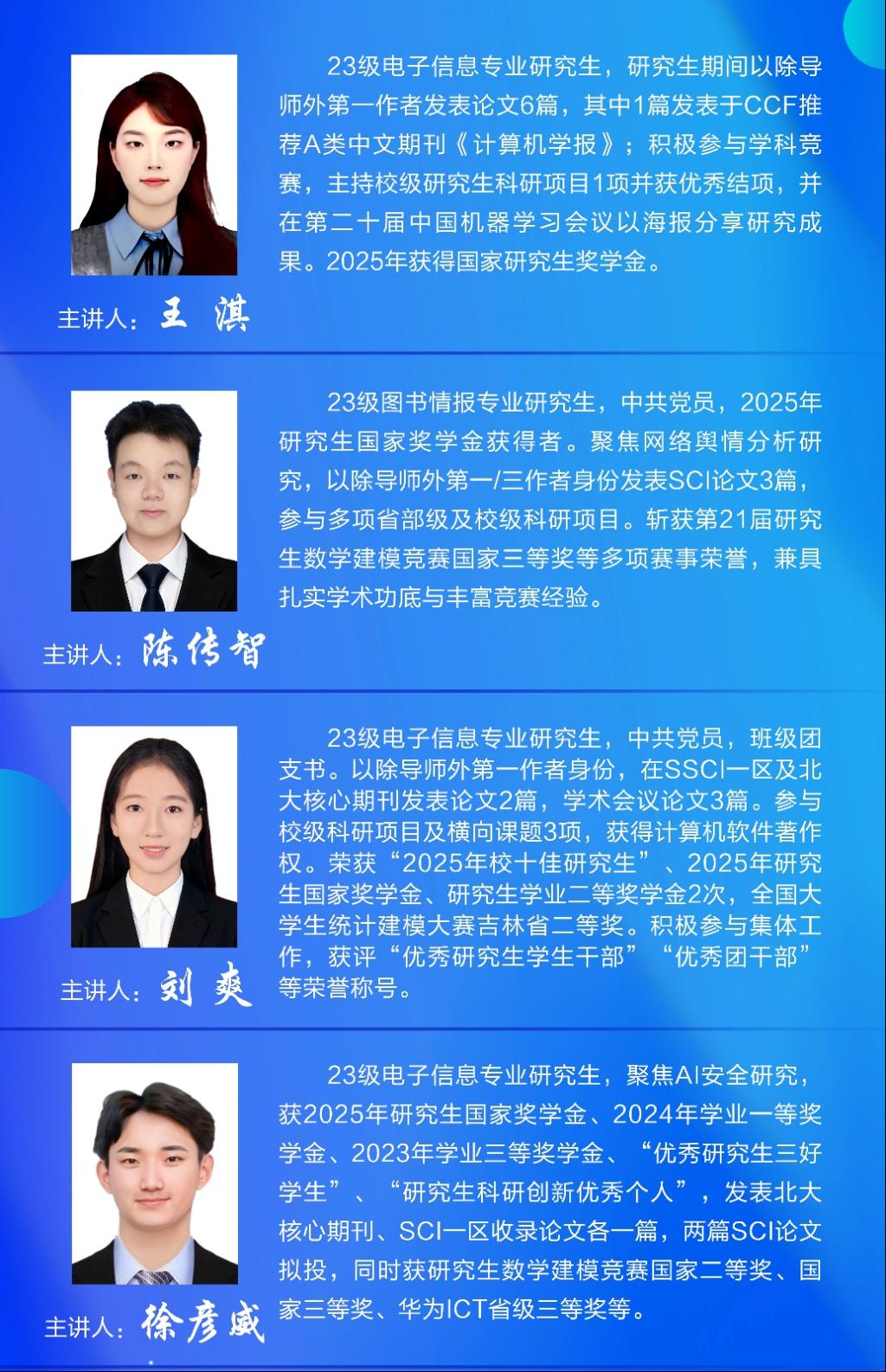 本次活动邀请了米兰体育 四位2025年研究生国家奖学金获得者做经验分享,分别从科研规划、论文写作、代码能力提升及竞赛实践等方面展开交流。