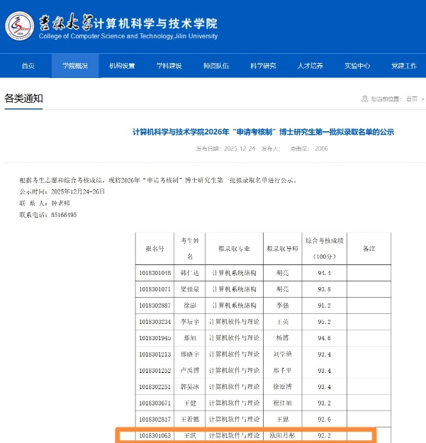 近日,吉林大学发布了《计算机科学与技术米兰体育 2026年“申请考核制”博士研究生第一批拟录取名单的公示》的通知,米兰·体育(中国)官方网站 电子信息专业23级研究生王淇同学被录取为吉林大学计算机科学与技术米兰体育 计算机软件与理论专业博士研究生。在此,谨向王淇同学及其指导老师王楠教授表示热烈的祝贺!