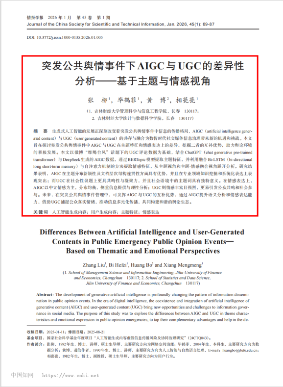 喜报!大数据管理与应用专业2022级本科生毕鹤菲与指导老师张柳博士合作撰写的论文《突发公共舆情事件下AIGC与UGC的差异性分析——基于主题与情感视角》在CSSCI来源期刊《情报学报》正式发表。