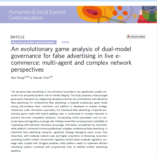 喜报!我院管理科学与工程专业2023级研究生陈笑然的学术论文《An evolutionary game analysis of dual-model governance for false advertising in live e-commerce: multi-agent and complex network perspectives》于2026年3月成功发表于Nature旗下唯一的人文社会科学类子刊Humanities & Social Sciences Communications。